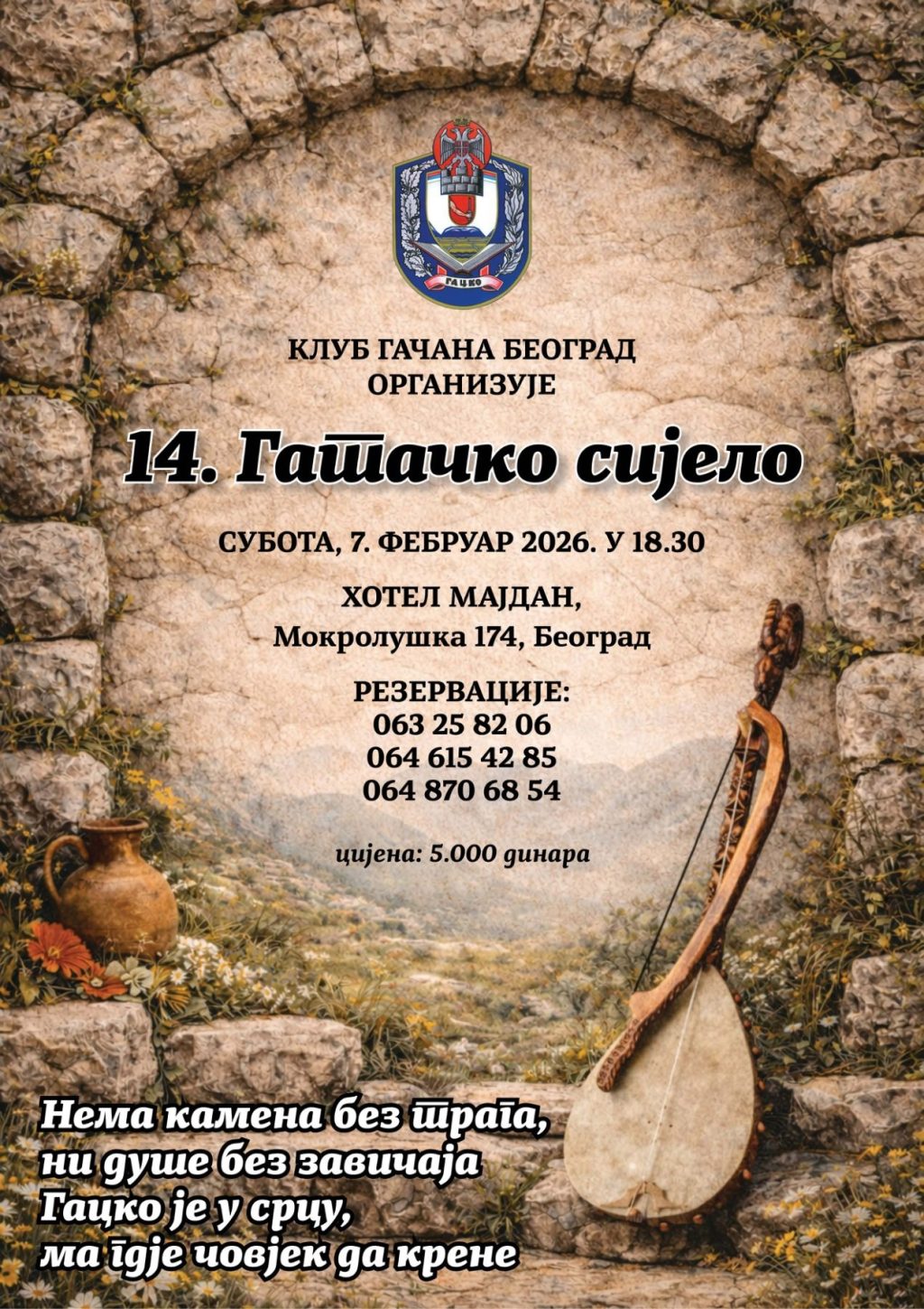 Клуб Гачана позива вас да се у суботу, 7. фебруара 2025. године, окупимо на 14. Гатачком сијелу у Београду, у великој сали хотела „Мајдан“, са почетком у 18.30 часова, и да заједно оживимо оно што нас везује за завичај и једне за друге.