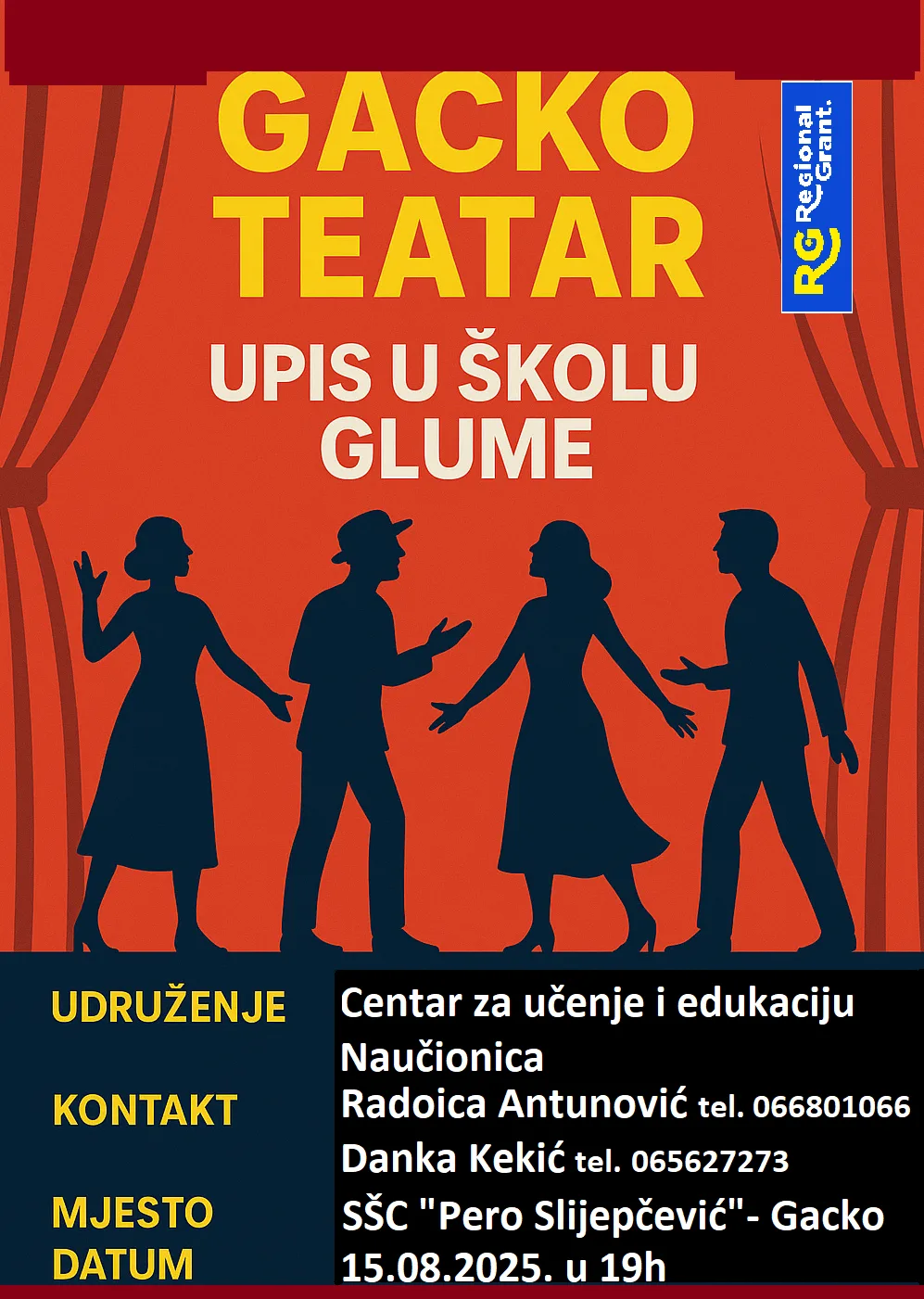 Удружење позива све заинтересоване да постану дио првог ГАЦКО ТЕАТРА – пријаве су отворене до 15. аугуста, а први састанак биће одржан истог дана у 19 сати у просторијама СШЦ “Перо Слијепчевић” у Гацку. За више информација и пријаве, можете контактирати Радоицу Антуновића (066 801 066) и Данку Кекић (065 627 273).