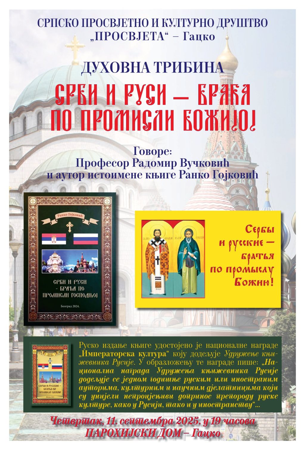 У Парохијском дому у Гацку, у четвртак 11- септембра, одржаће се духовна трибина на којој ће бити представљена књига „Срби и Руси – браћа по промисли Божијој“ аутора Ранка Гојковића. Поред аутора, о дjелу и тематици говориће и професор Радомир Вучковић.
